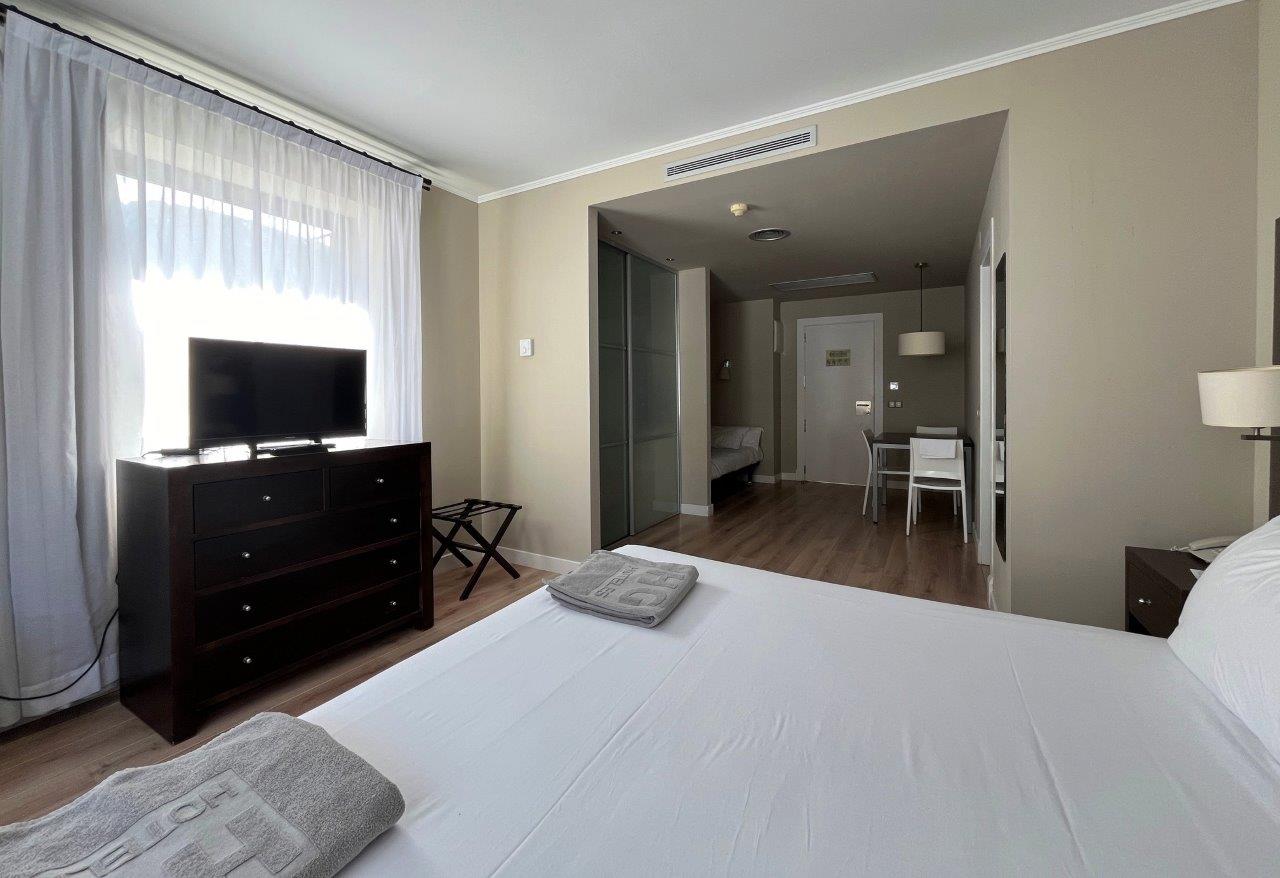 Habitación exterior de 35m2 (aprox) con 2 camas individuales de 1x2m o 1 Cama Doble de 1,80m bajo disponibilidad + 1 Cama turca de 90x1,90m. Dispone además de minikitchen de cortesía con microondas, pila y nevera.